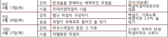 - 강의장소 : 서울시 종로구 삼청로4 막걸리학교