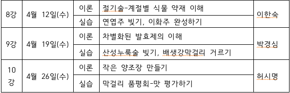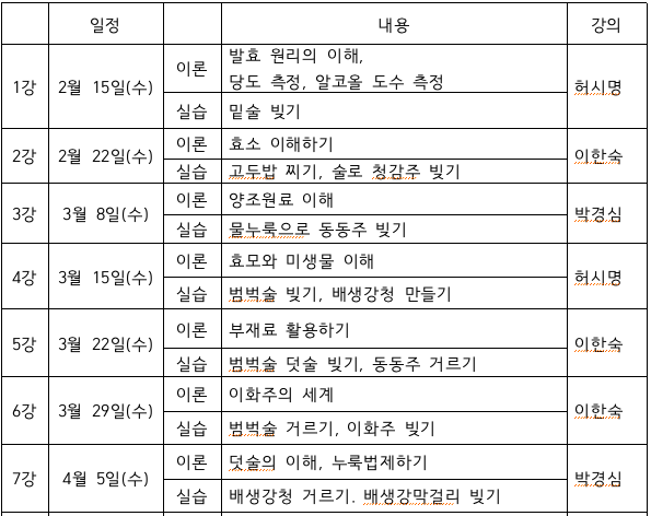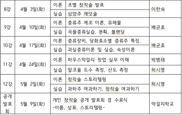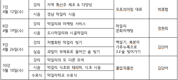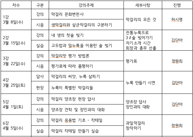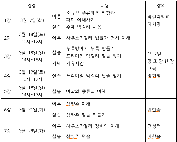 * 술빚기 실습 3회, 막걸리칵테일 실습 1회, 현장답사 1회(막걸리 시음 1회에 6종류 시음)
