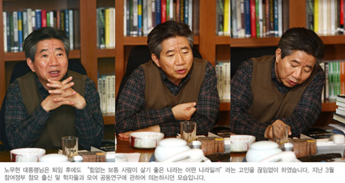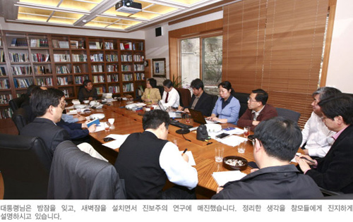 | ▲ 서거 2개월 여 전 '진보주의 연구'에 대해 논의하고 있는 노 전 대통령ⓒ사람사는세상 |