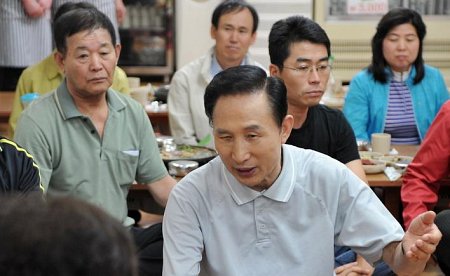 | ▲ 지난 달 25일 재래시장을 찾은 이명박 대통령이 상인들과 오찬 간담회를 갖고 있다. 대형마트와 재래시장의 구조적인 문제에 대해 이 대통령이 이날 내놓은 대안은 '인터넷 직거래'였다. ⓒ청와대 |