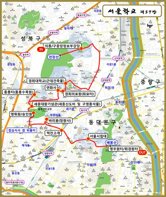 초봄, 서울학교(교장 최연. 인문지리기행학자, 서울해설가)의 제57강은 서울 동대문구 회기동·청량리동·석관동에 걸쳐 있는 해발 140m의 야트막한 천장산에서 바리봉을 지나 배봉산(拜峰山 108m)에 이르는 산줄기를 따라 그곳에 조성되었던 능원(陵園)와 그 원찰(願刹)들을 둘러보겠습니다.
