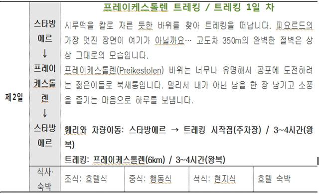 피요르드 트레킹의 첫 대상지는 시루떡같이 잘려나간 채 우뚝 선 뤼세 피요르드를 지키는 프레이케스톨렌입니다. 노르웨이 피요르드 트레킹의 대표격이기도 하고 웅장한 기풍으로 서 있어서 가장 인기 있는 피요르드 트레킹입니다.