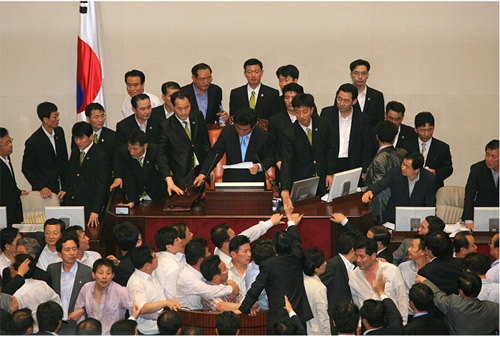 | ▲ 한나라당 의원들과 국회 경위들의 호위 속에 의사봉을 두드리고 있는 이윤성 부의장ⓒ프레시안 |