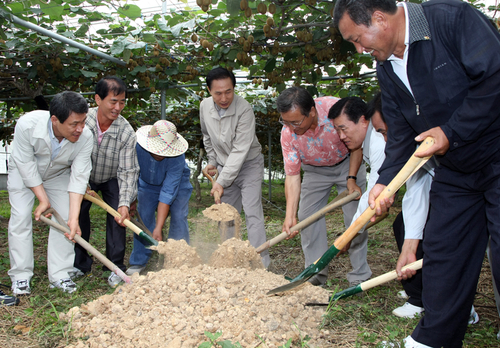 | ▲ 이명박 대통령이 31일 경남 고성군 참다래 마을을 방문한 자리에서 농민들과 함께 친환경 미생물 배양흙을 밭에 뿌리는 작업을 진행하고 있다. ⓒ연합뉴스 |