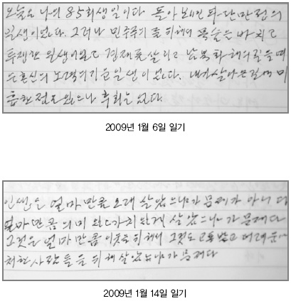 21일 오전 추모 홈페이지를 통해 공개된 일기에는 김 전 대통령의 가족에 대한 사랑, 인생에 대한 소회, 이명박 정부에 대한 불안감 등이 가감없이 담겨있다.