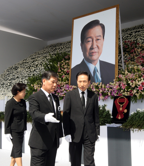 이 대통령은 이어 김 전 대통령이 차남 홍업, 삼남 홍걸 씨 등 유족들과 악수를 나누며 위로한 뒤 민주당 정세균 대표 등 지도부와도 인사를 나눴다. 지난 대선에서 고배를 마셨던 무소속 정동영 의원과도 대선 이후 처음으로 조우했다.