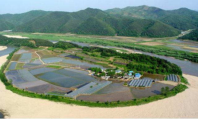 회룡포(回龍浦)는 낙동강 지류 내성천이 휘감아 돌아 만든 물도리동으로 산과 강에 둘러싸인 오지로서 한때는 죄인의 임시 귀양지였습니다. 사람이 들어와 산 것은 조선 고종 때 예천의 아랫마을 의성에 살던 경주김씨 일가가 소나무를 베고 논밭을 개간하면서 정착했는데 그래서 의성포란 이름을 얻었으나, 의성포로 불리는 것이 의성군에 있는 것으로 오인되는 경우가 많아 예천군에서 회룡포로 고쳐 부르고 있습니다.