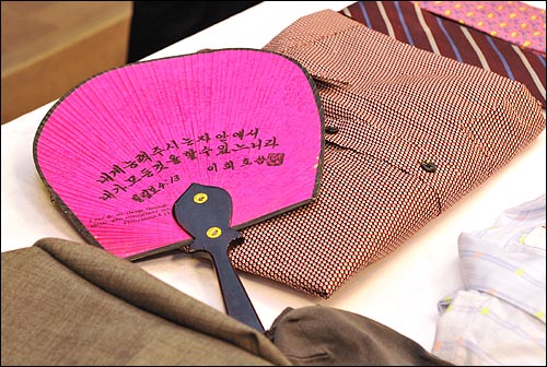 | ▲ 이희호 여사가 쓴 성경구절이 적혀있는 부채ⓒ인터넷사진공동취재단 |