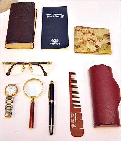책과 글을 놓지 않았던 고인의 만년필, 수첩, 안경 등도 눈에 띄었다. 특히 활자가 작은 낡은 영어 사전은 일본 삼성당에서 쇼와 47년(1972년) 발간한 것으로 고인이 최근까지 사용한 것이다. 김 전 대통령이 일본에 망명 했을 때 구입한 것으로 추정된다.