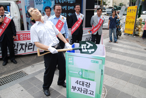 이어 진보신당은 서민 장바구니에서 삽으로 동전을 퍼 부자금고에 나르는 퍼포먼스를 진행했다.
