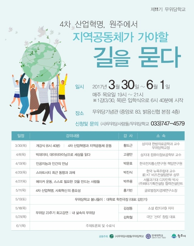 '4차 산업혁명, 원주에서 지역공동체가 가야할 길을 묻다'라는 주제로 진행되는 이번 강의는 오는 3월 30일부터 6월 1일까지 강원도 원주 무위당기념관에서 매주 한 차례씩 열린다.