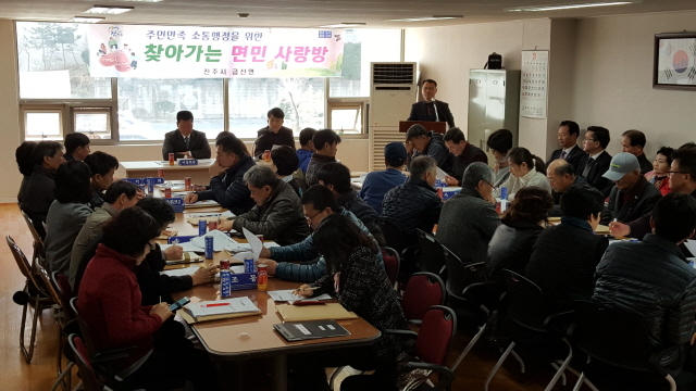 '찾아 가는 면민 사랑방'은 아파트 주민들의 생활불편 사항을 현장에서 생생히 듣고 해결하는 한편 자연마을과 아파트 주민 간 상호 소통기회 확대를 통해 모범적인 공동체 형성을 도모하기 위해 추진하는 이색 시책이다.