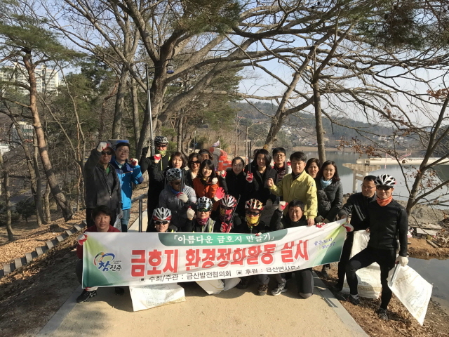 경남 진주시 금산면사무소(면장 정현대)는 지난 12일 금호지 일원에서 자연보호협의회, 자전거동호회 회원 등이 참여한 가운데 깨끗한 금산면 가꾸기 환경정화활동을 실시했다.