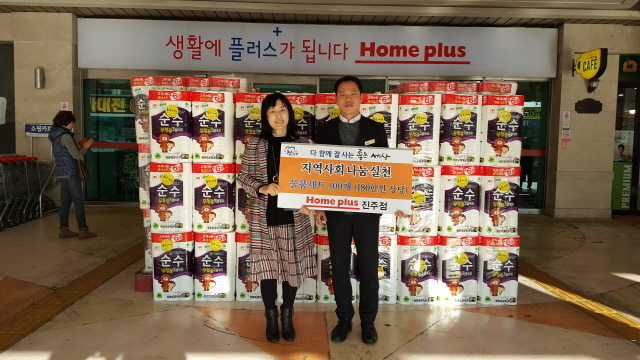 홈플러스 진주점은 지난해에도 지역사회 나눔경영실천의 일환으로 화장지 및 부식류 등(385만원 상당)을 3회에 걸쳐‘좋은세상’에 기탁해 저소득층 200세대에 전달된 바 있다.