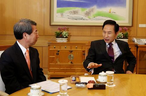 | ▲ ⓒ이명박 대통령은 6일 정운찬 국무총리로부터 처음으로 주례보고를 받았다. ⓒ청와대 |