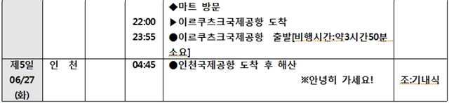 제5일, 마지막 날은 이르쿠츠크국제공항을 떠나 인천으로 향함으로써 4박 5일간의 아름다운 바이칼 환상체험 답사를 마칩니다. 들꽃의 계절, 당신의 고단한 심신을 바이칼에 풍덩 던져 새로운 기운과 정신을 가득 길어오는 여행길이 되시기 바랍니다.