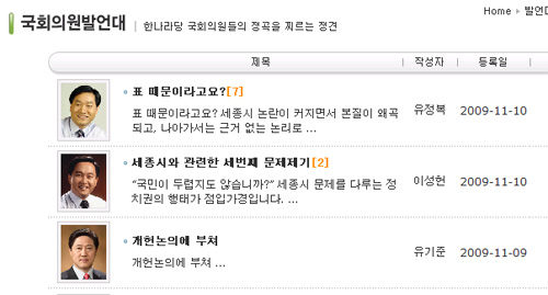 | ▲ 당 홈페이지 국회의원 발언대에 줄줄이 올라오고 있는 친박 의원들의 글ⓒ한나라당 |