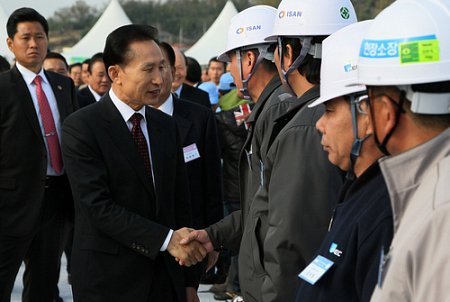 | ▲ 이명박 대통령이 22일 오후 전남 광주시 승촌동 영산강 둔치에서 열린 '영산강살리기 희망선포식'에 참석해 공사 관계자들을 격려하고 있다. ⓒ연합뉴스 |