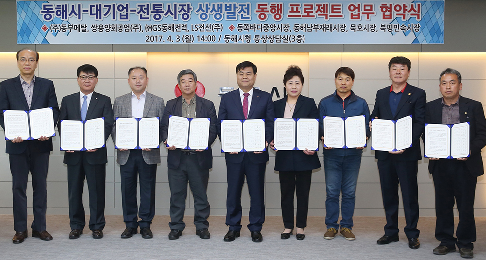▲강원 동해시는 3일 침체된 전통시장과 골목경제 활성화를 위해 관내 대기업과의 상생 발전을 위한 동행 프로젝트 업무 협약식이 심규언 동해시장, (주)동부메탈, 쌍용양회공업(주), (주)GS동해전력, LS전선(주) 등 4개 관내 대기업, 동쪽바다중앙시장, 동해남부재래시장, 묵호시장, 북평민속시장 등 전통시장 4개소 관계자들이 참석한 가운데 체결하고 있다. ⓒ동해시