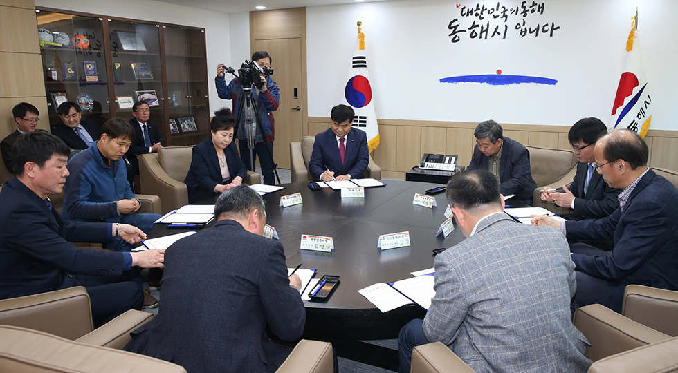 ▲3일 강원 동해시는 침체된 전통시장과 골목경제 활성화를 위해 관내 대기업과의 상생 발전을 위한 동행 프로젝트 업무 협약식을 심규언 동해시장, (주)동부메탈, 쌍용양회공업(주), (주)GS동해전력, LS전선(주) 등 4개 관내 대기업, 동쪽바다중앙시장, 동해남부재래시장, 묵호시장, 북평민속시장 등 전통시장 4개소 관계자 등이 참석한 가운데 진행하고 있다. ⓒ동해시
