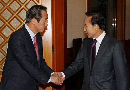 | ▲ 이명박 대통령과 정몽준 한나라당 대표가 29일 청와대에서 만나 악수를 나누고 있다. ⓒ청와대 |