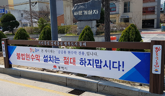 시는 지난 2월 관내 10개동 유동광고물 부착 성행지역에 대한 현장조사를 실시해 원활한 교통 흐름과 보행자 안전 확보 등 설치여건을 면밀히 분석해 시청로터리, 천곡교차로, 효가사거리, 부곡삼거리, 묵호역굴다리 등 5개소에 저단형 현수막 7대 설치했다.