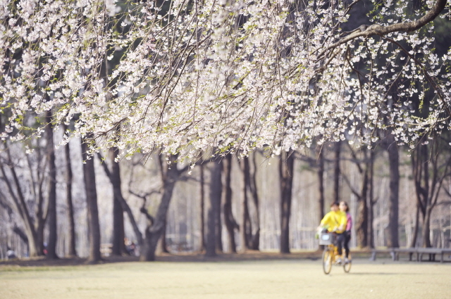 어둑어둑한 하늘도 분홍을 막을 순 없었다. 노란 불빛이 비추는 벚나무는 신비로운 느낌마저 들게 했다. 바이크센터에서 빌린 자전거는 탁월했다.
