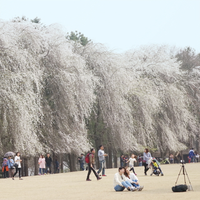 일반적인 벚꽃나무와 다르게 아래로 죽 늘어뜨린 가지 사이로 새하얀 벚꽃이 흩날려 장관을 이룬다.