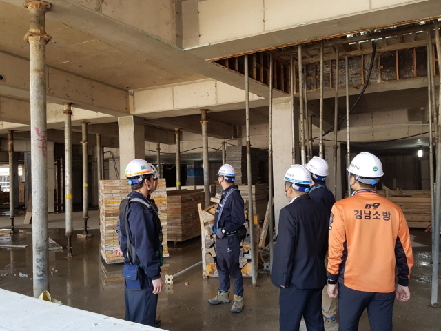 ▲진주소방서가 17일 관내 대형공사장에 대한 지도점검을 실시하고 있다. ⓒ진주소방서
