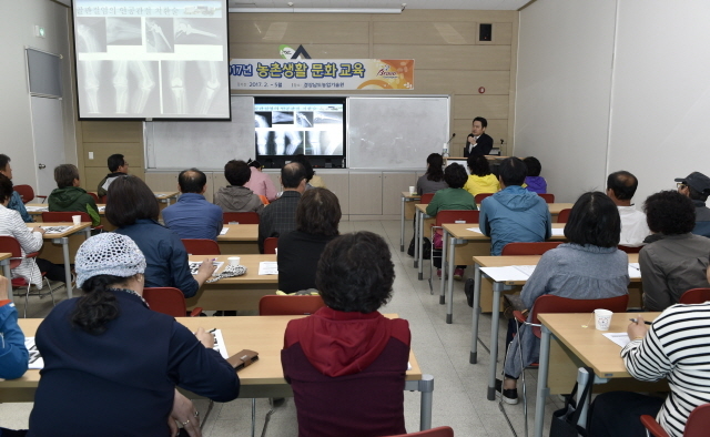 ▲경남도농기원은 19일 반복된 농사일로 인한 근골격계 질환 예방을 위한 농작업안전반 교육을 열었다. ⓒ경상남도