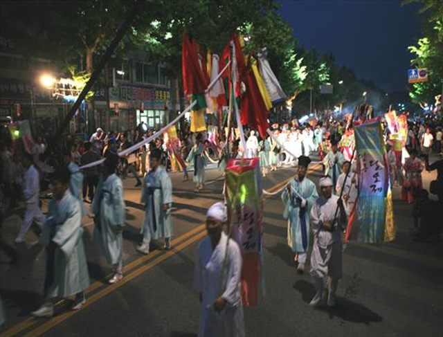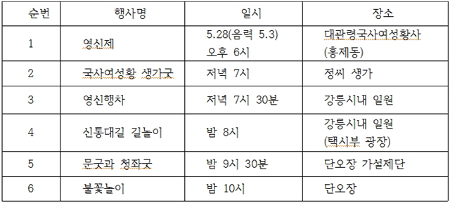강릉단오제는 음력 5월 5일(양력 5월 30일 화요일) 단오를 가운데 놓고 앞뒤로 8일 동안 합니다. 그중 가장 재밌고 뜻깊은 행사는 음력 5월 3일(양 5월 28일 일요일) 저녁에 시작합니다. 바로 음력 4월 보름(양 5월 10일 수요일), 대관령에서 모시고 내려온 신목과 대관령국사성황의 신위, 그리고 대관령국사여성황의 신위를 남대천 가설굿당으로 모셔가는 날이기 때문입니다. 본격적인 축제의 시작인 셈입니다.