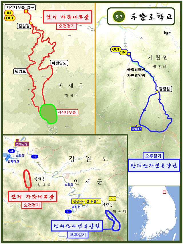 두발로학교가 5월 27일(토)에 걷는 제57강 <인제 자작나무숲과 방태산자연휴양림>의 구체적인 일정은 다음과 같습니다.