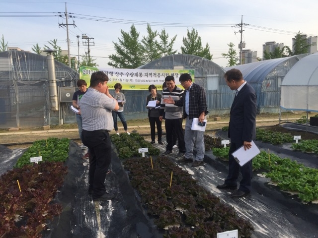 현장 평가회는 농촌진흥청 국립원예특작과학원과 공동으로 추진하고 있는데, 순회 일정 중 둘째 날인 11일 상추 주산단지인 김해시와 진주시 농장에서 새로 육성한 ‘춘하추적치마’ 등 5품종 상추에 대해 도내 지역적 특성을 비교 검토했다.