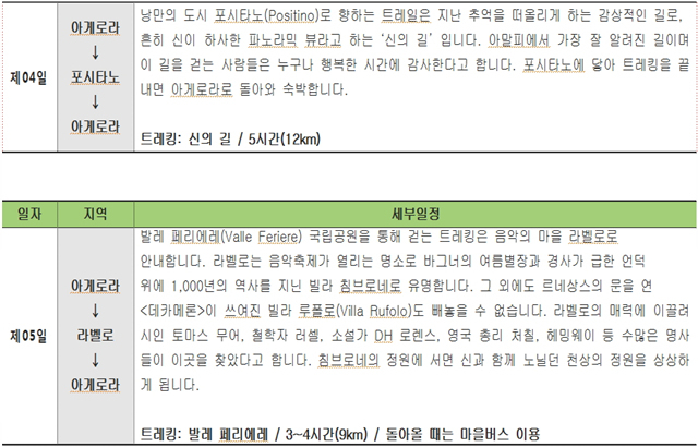 올 가을, 또는 새해 초, 이태리 남부 아말피 지방으로 꿈같은 여행을 다녀오세요. 이태리캠프(캠프장 채경석, 부캠프장 최진우. 해외트레킹 전문가)가 준비한 <이태리 남부해안 트레킹 8일>의 내용은 다음과 같습니다.