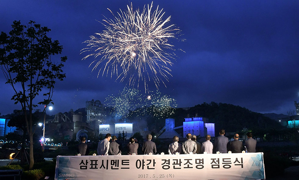 ▲ 지난 25일 오후 강원 삼척시 장미공원에서 김양호 삼척시장과 최병길 삼표시멘트 대표이사를 비롯한 기관단체장 등이 참석한 가운데 삼표시멘트 삼척공장 경관조명 점등식을 갖고 있다.ⓒ삼척시