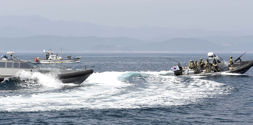 ▲해군 1함대(사령관 소장 박기경)는 29일 동해 북방한계선(NLL) 인근 해상에서 NLL 절대 사수와 완벽한 경계태세를 확립하기 위해 실전적이고 강도 높은 ‘대응훈련’을 실시하고 있다. 이날 훈련에는 해군 1함대 고속정 등 함정 3척, 3특전대대(UDT) 대원 등이 참가했다. ⓒ해군1함대