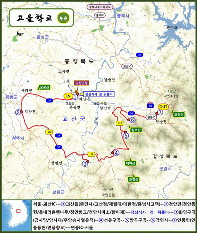 이날 답사코스는 서울-괴산IC-괴산읍(충민사/고산정/제월대/애한정/홍범식고택)-청안면(청안동헌/읍내리은행나무/청안향교/청안사마소/함이재)-점심식사 겸 뒤풀이-화양구곡(금사담/암사재/우암송시열유적)-선유구곡-쌍곡구곡-각연사-연풍면(연풍동헌/연풍향교)-연풍IC-서울의 순입니다.