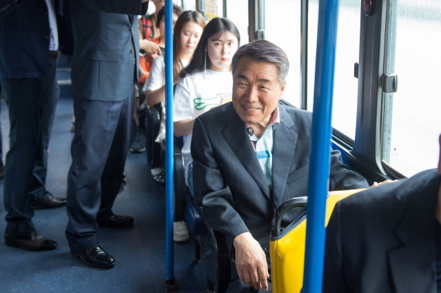▲시내버스로 출근하는 이창희 시장. ⓒ진주시