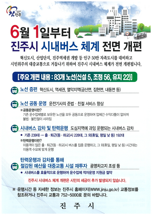 시는 이번 개편으로 인한 시민들의 혼란을 최소화 하고 빠른 시일 내 개편을 마무리하기 위해 읍면동 주민센터 실무자들에 대한 사전 교육을 실시하고, 세대별 홍보전단지 배부와 시내버스 승강장의 노선안내도 정비, 각종 언론보도와 시 홈페이지, 시에서 운영하는 진주버스정보 앱을 통해서도 개편 준비사항과 개편과정을 시민들에게 알려 나감으로써 시민들의 불편을 최소화 할 수 있도록 행정력을 집중하고 있다며 시민들의 협조를 당부했다.