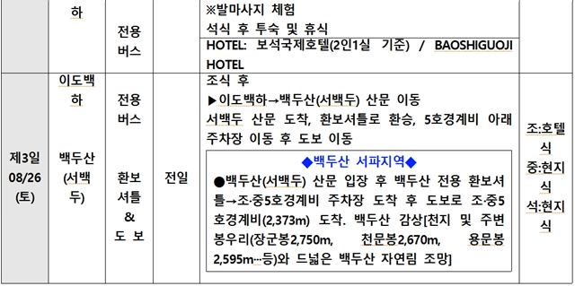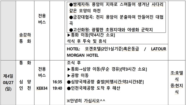 하산 후 금강대협곡, 쌍제자하 등 백두산 화산폭발이 남긴 신묘한 풍경들을 감상합니다. 이날 오후 다시 통화로 이동, 1박 한 다음날, 8월 27일(일), 통화에서 심양으로 이동해 북릉공원, 서탑가 등 심양시내를 관광한 후 인천공항으로 향합니다.