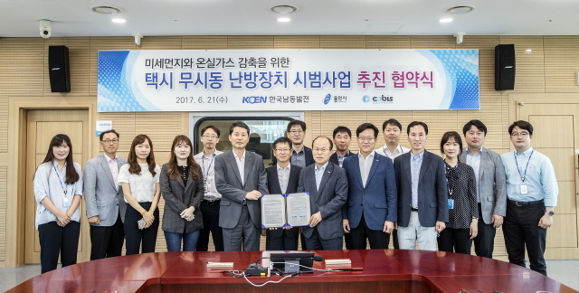 한국남동발전(사장 장재원)은 21일 경남 진주 본사에서 용인시청 이택호 기후에너지과 과장, ㈜코비스 전종복 대표 등 관계자들이 참석한 가운데 ‘미세먼지와 온실가스 감축을 위한 택시 무(無)시동 난방장치 시범사업 추진’ 협약식을 체결했다고 밝혔다.