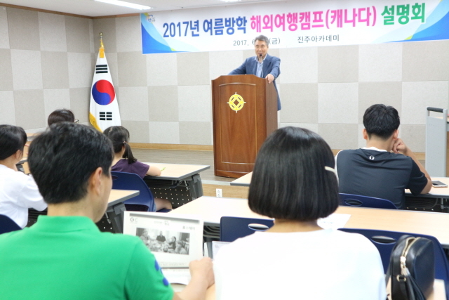 지난 2013년 처음 시작해 올해로 아홉 번째를 맞는 캐나다 해외영어캠프는 영어권 나라의 문화를 배우며 영어학습에 대한 두려움을 극복하고 자기주도학습과 더불어 글로벌 인재육성을 위해 운영되고 있다. 진주아카데미 8주 이상 프로그램 수료생을 대상으로 지난 4월 10~21일까지 진주아카데미 홈페이지에서 신청을 받아 지난달 1일 컴퓨터추첨을 통해 초·중학생 30명을 최종 확정했다.