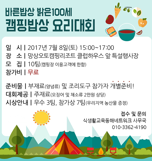 이번 행사는 식생활교육동해네트워크(상임대표 우미강)에서 주최하고 동해시시설관리공단에서 후원하며 망상오토캠핑리조트 자동차캠핑장 특별행사장에서 개최된다.