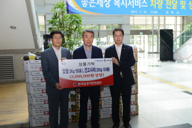이날 진주시의 좋은 세상 복지서비스 차량 전달 및 성품 기탁식에는 공단의 남상문 교육홍보이사 등 공단관계자들이 직접 참가해 찹쌀과 고사리를 이창희 진주시장에게 직접 기탁하고, 이 시장과 함께 좋은 세상 복지서비스 차량에 실어 복지시설과 주민들에게 전달했다.