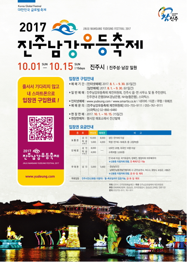 경남 진주시와 진주문화예술재단(이사장 최용호)은 대한민국 글로벌 축제인 진주남강유등축제 사전 홍보와 국내외 관람객 편의 제공을 위해 오는 9월 30일까지 인터넷, 스마트폰 앱, 현장 판매처 등을 통해 사전 입장권을 판매한다고 2일 밝혔다.