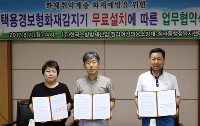 강원 삼척시 정라동행정복지센터(동장 김진천)와 ㈜한국소방방재산업(대표 김성근)과 정라동여성의용소방대(대장 안미숙)는 7일 정라동행정복지센터 회의실에서 화재취약계층에 대한 주택용 경보형화재감지기 무료설치 협약식을 가졌다.