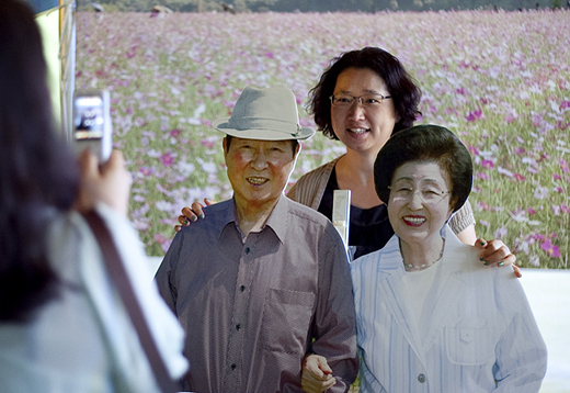 | ▲ 김대중 전 대통령 추모 문화제에서 한 시민이 생전의 김 전 대통령, 이희호 여사 사진을 배경으로 사진을 찍고 있다. ⓒ프레시안(최형락) |