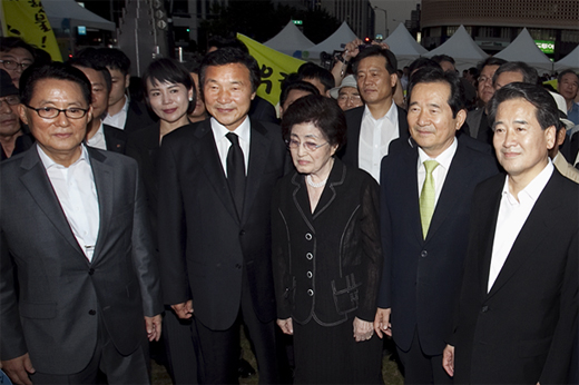 | ▲ 'DJ의 영원한 비서실장, 민주당 박지원 비대위 대표와 함께, 유력 당권 주자인, 손학규, 정세균 전 대표, 정동영 의원이 이희호 여사와 포즈를 취하고 있다. ⓒ프레시안(최형락) |