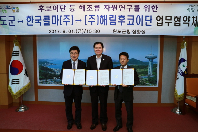 이날 협약에 따라 완도군과 한국콜마(주), (주)해림후코이단은 완도군 청정해역에서 생산되는 다양한 해양자원을 이용한 제품개발과 차세대 소재개발, 해양헬스케어 활성화 지원, 완도군 브랜드 가치 제고와 지역특산물 해조류 자원연구에 나선다.