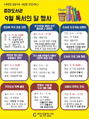독서의 달 행사에 대한 자세한 사항은 도서관 홈페이지에서 확인할 수 있으며, 중마도서관으로도 문의 할 수 있다.